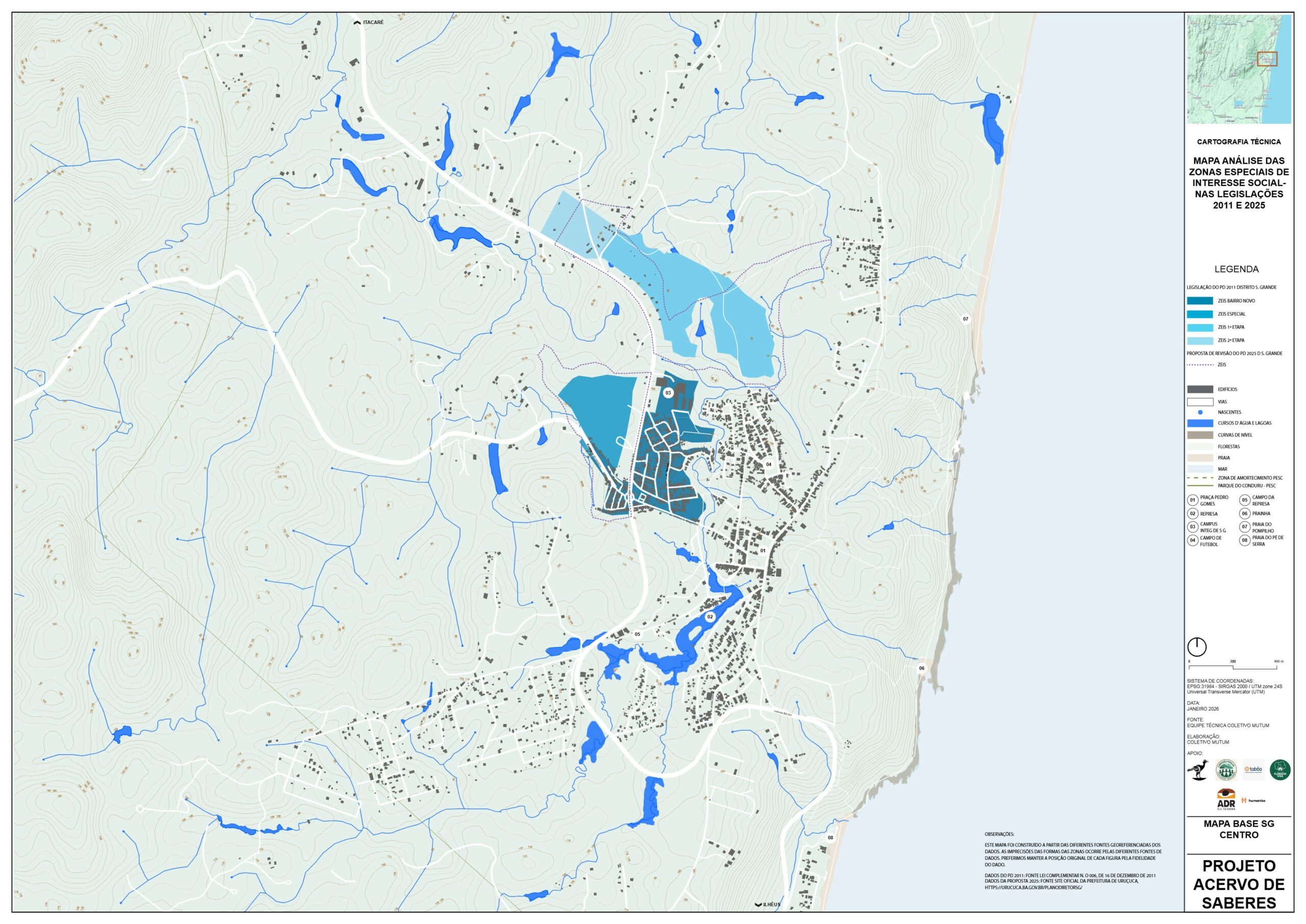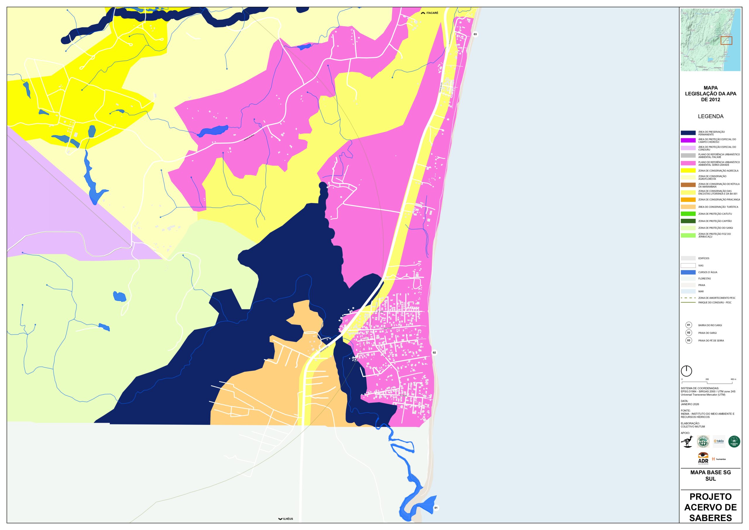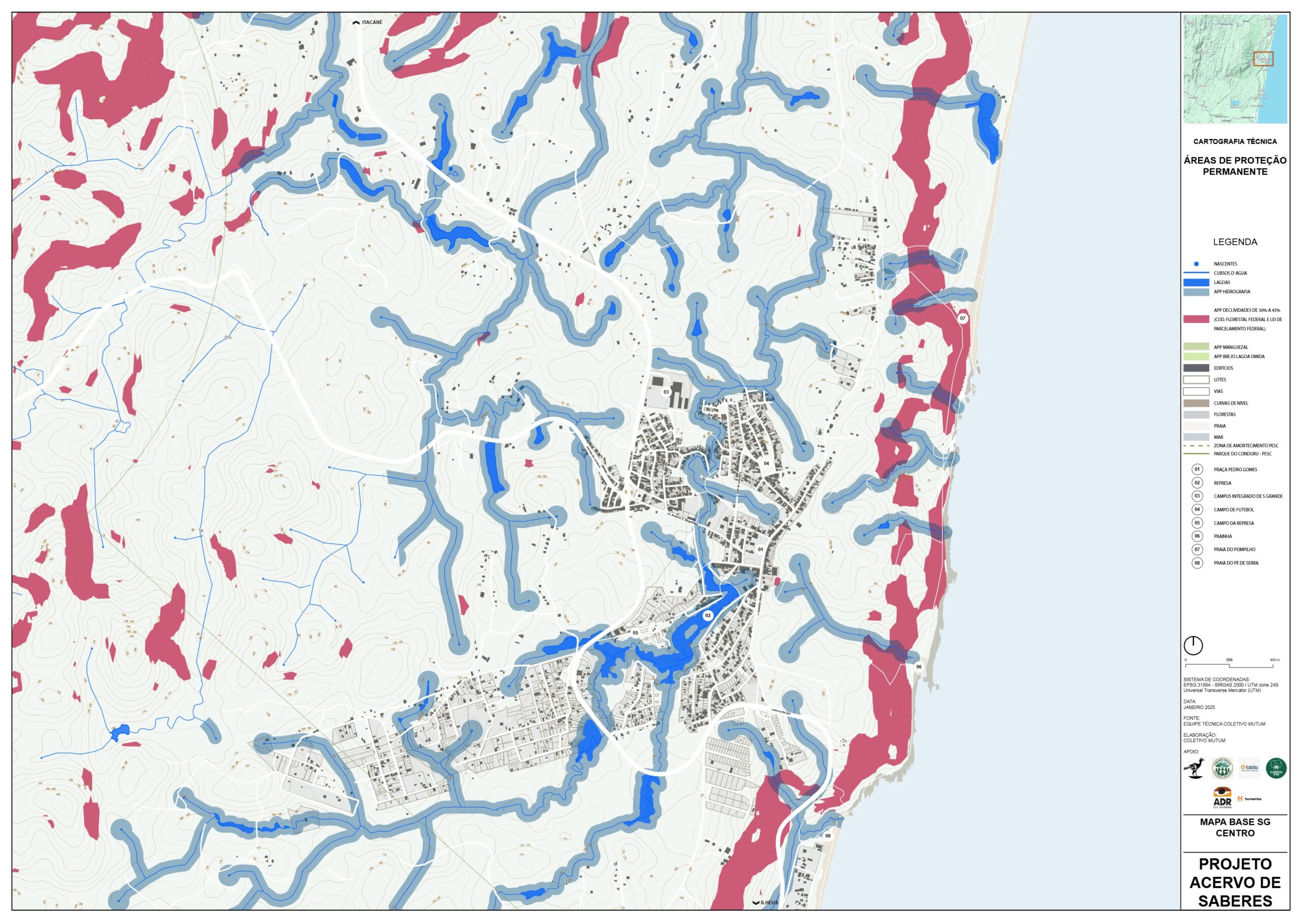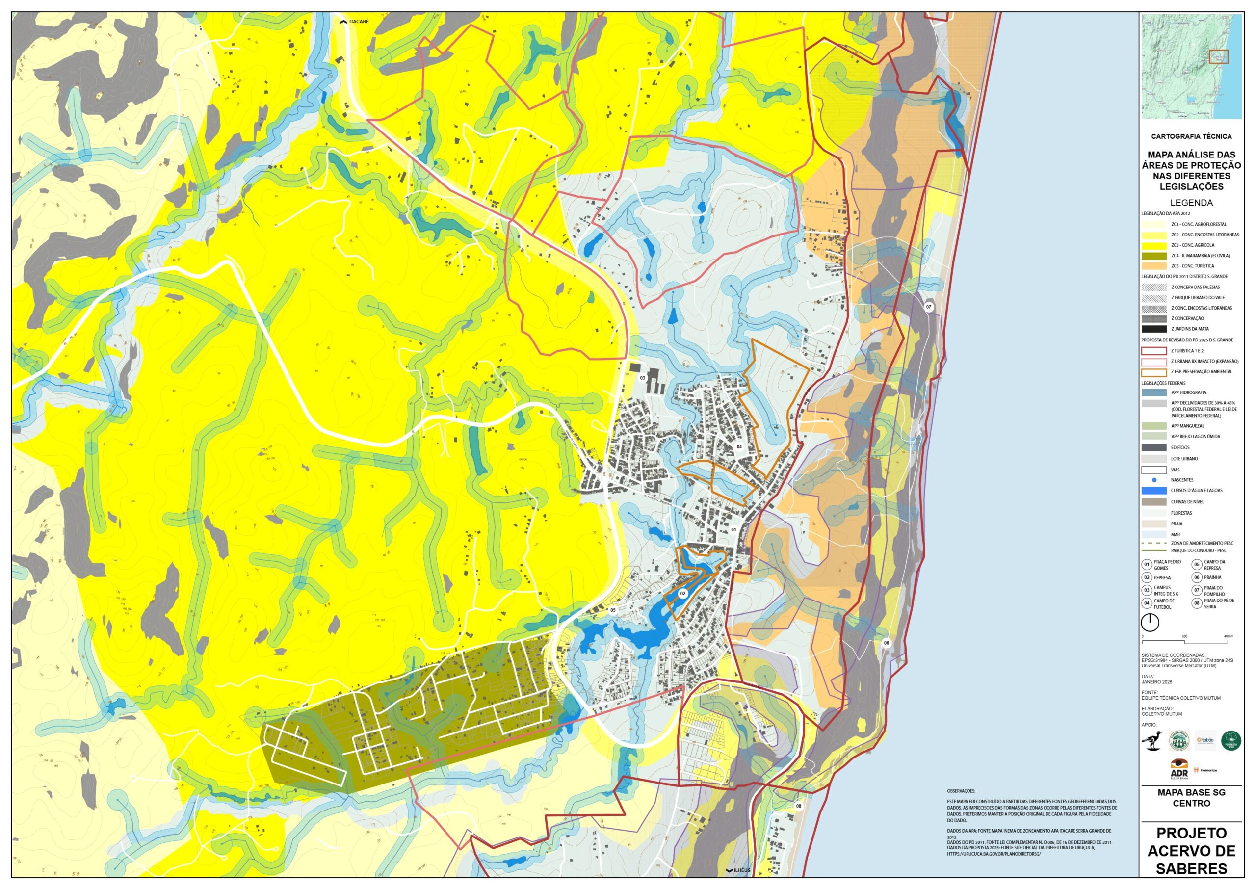 Este Mapa de análise da legislação para as áreas de proteção tem o objetivo de mostrar as diferentes porções do território que são protegidas por Lei, as convergências entre Legislações Federais, como o Código Florestal e Lei da Mata Atlântica; Estadual, como o Plano de Manejo da APA Itacaré – Serra Grande e Municipal, como o Plano de Desenvolvimento Urbano e Territorial de Serra Grande (PDUT) de 2011, e as divergências entre as propostas da revisão do Plano Diretor de 2025.