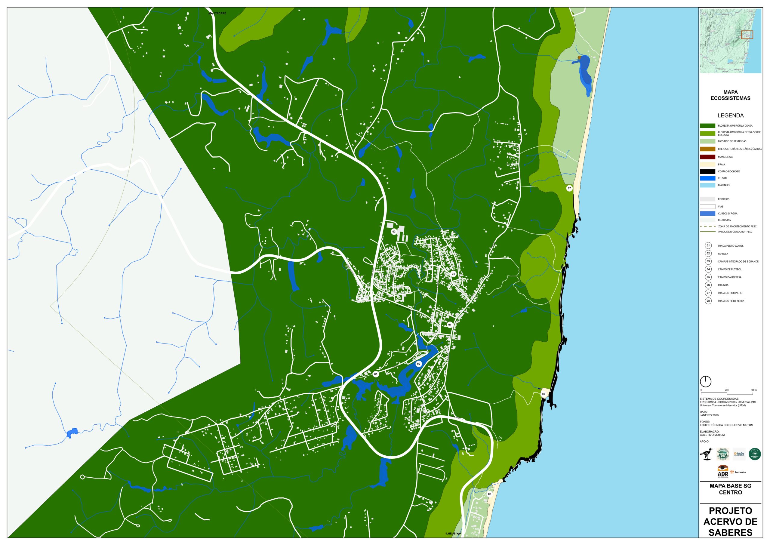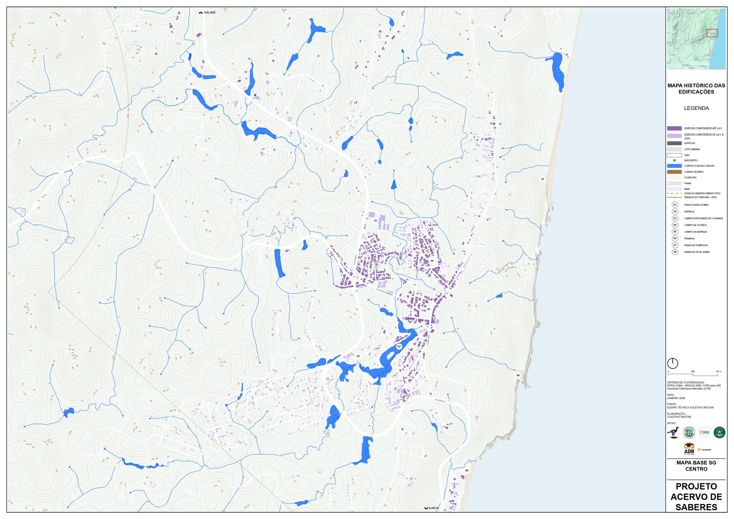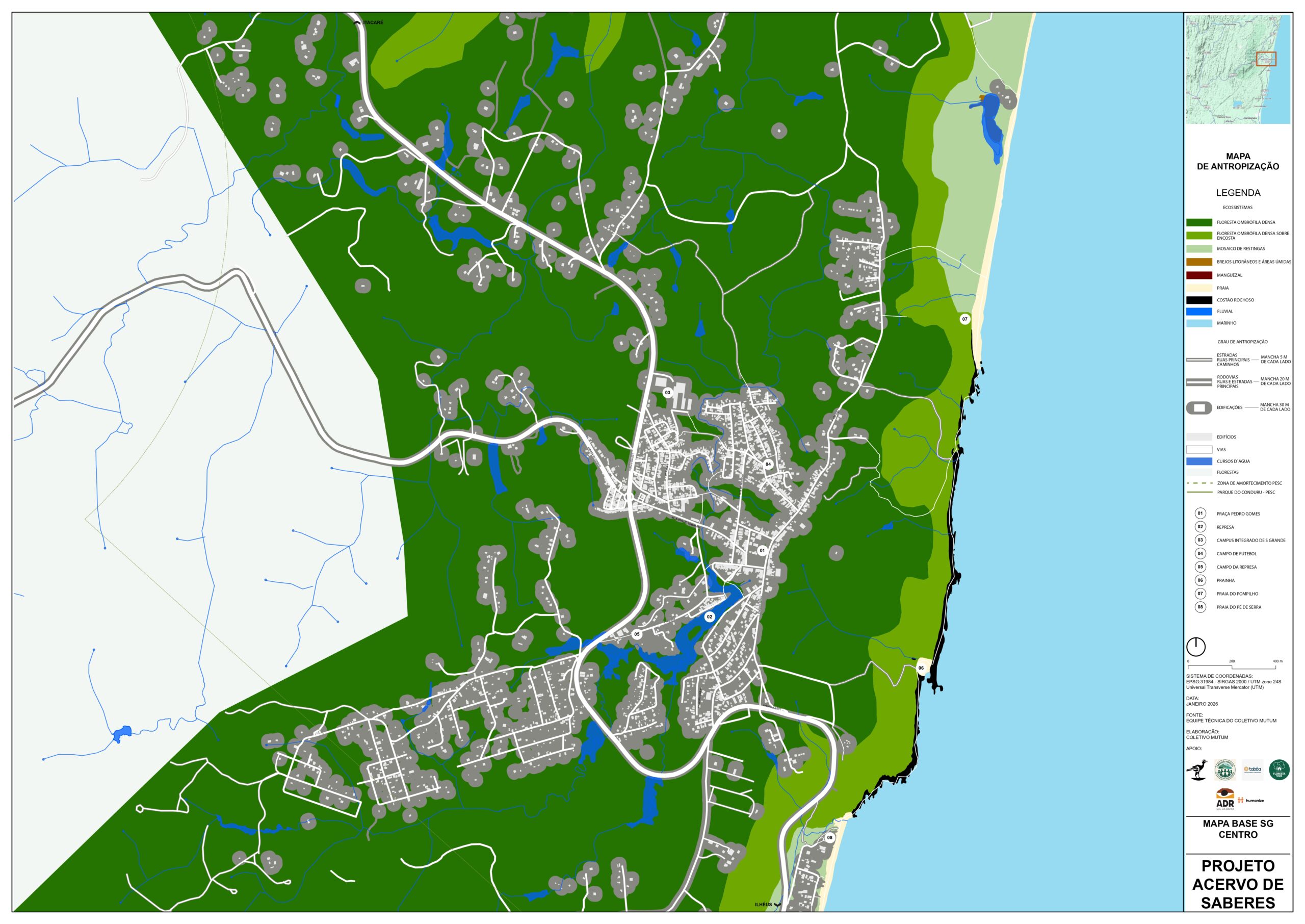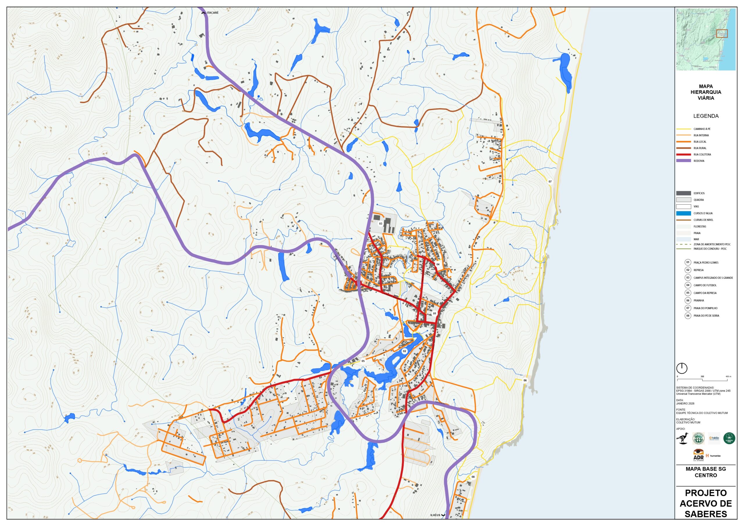 Este Mapa de análise da legislação para as áreas de proteção tem o objetivo de mostrar as diferentes porções do território que são protegidas por Lei, as convergências entre Legislações Federais, como o Código Florestal e Lei da Mata Atlântica; Estadual, como o Plano de Manejo da APA Itacaré – Serra Grande e Municipal, como o Plano de Desenvolvimento Urbano e Territorial de Serra Grande (PDUT) de 2011, e as divergências entre as propostas da revisão do Plano Diretor de 2025.