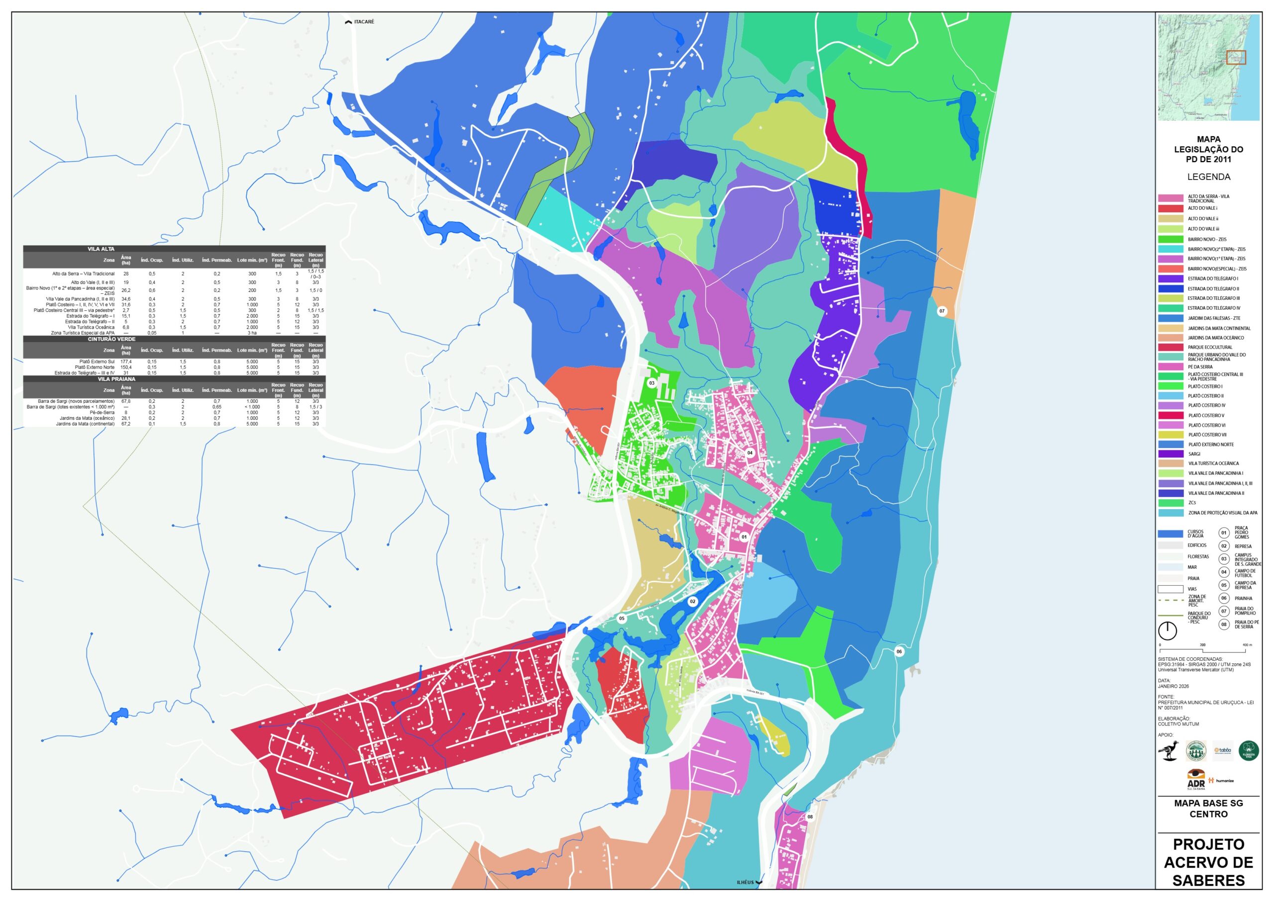 Serra Grande viveu uma particularidade importante ao realizar entre 2010 e 2011 um Plano Diretor Distrital cujas diretrizes vieram da APA Itacaré Serra Grande, quando Uruçuca ainda não tinha 20.000 hab. Mesmo com certa fragilidade legal, o Plano Distrital foi formalizado como lei Municipal, fortalecendo um histórico de planejamento de paisagem costeira e do bioma Mata Atlântica que detalhamos a seguir.