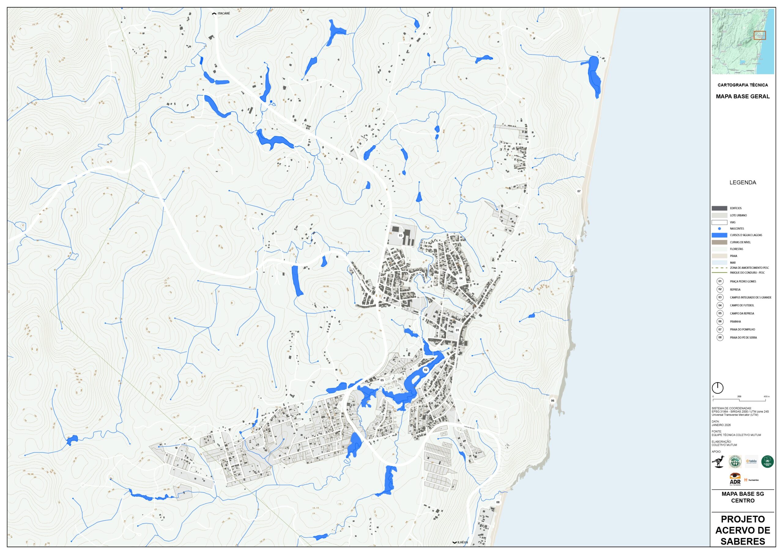 O Mapa Base de Serra Grande é a representação cartográfica fundamental do território, reunindo em uma única visão os principais elementos naturais e urbanos que estruturam a paisagem local. Ele funciona como ponto de partida para compreender a organização espacial do distrito e como referência para qualquer sobreposição futura de informações, sejam elas diagnósticos ambientais, apontamentos comunitários, indicações de problemas, propostas ou potenciais do território.