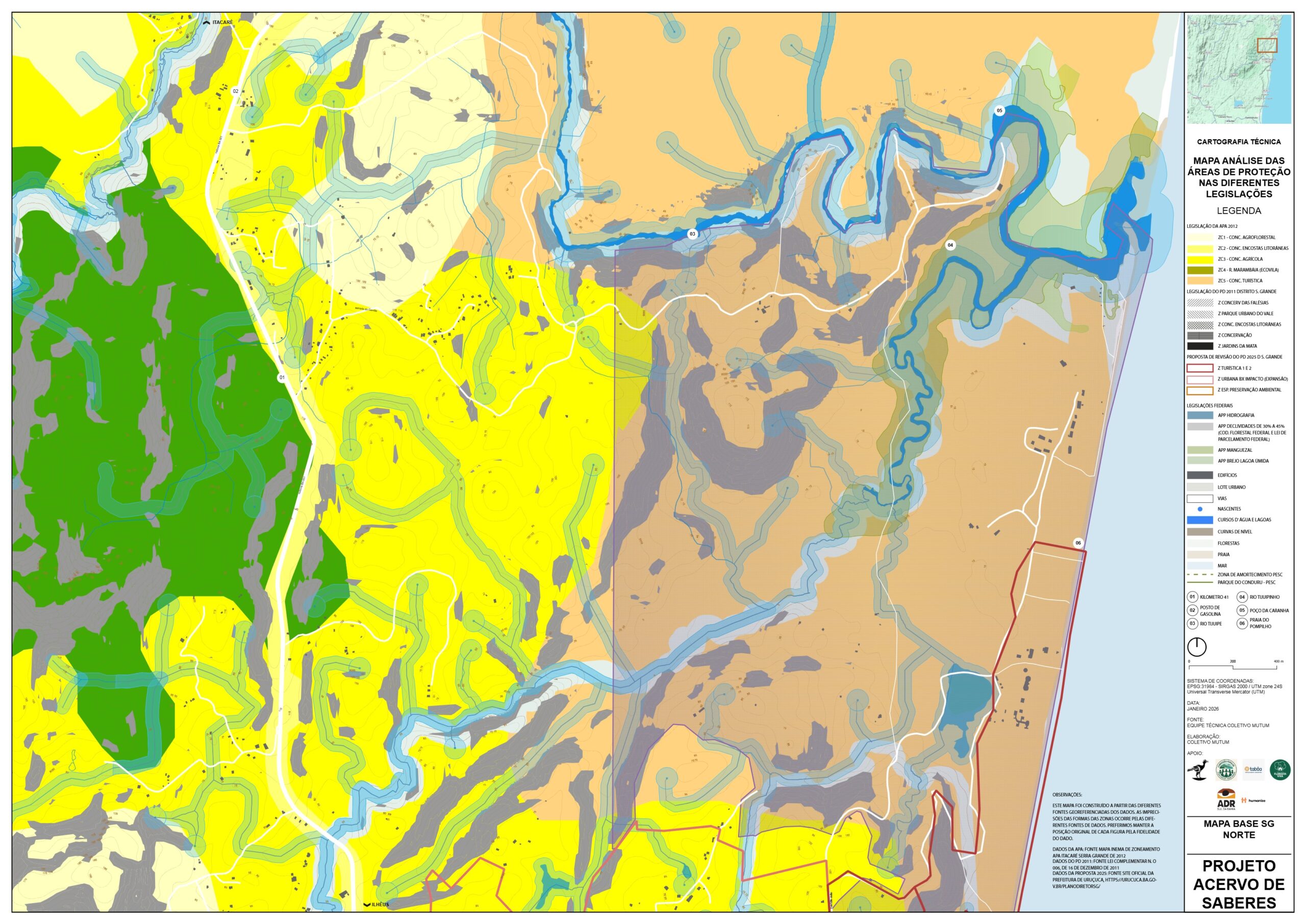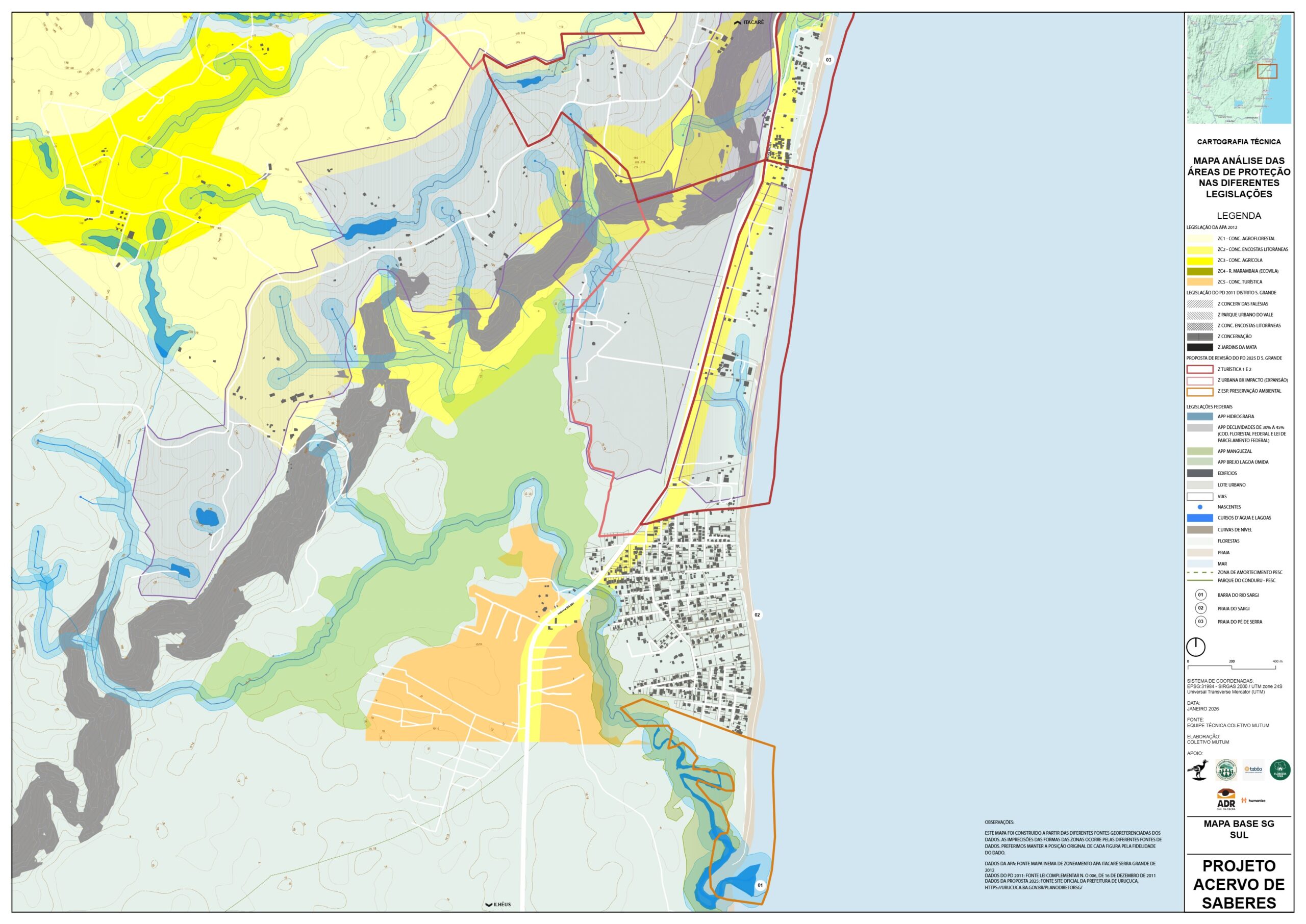 Este Mapa de análise da legislação para as áreas de proteção tem o objetivo de mostrar as diferentes porções do território que são protegidas por Lei, as convergências entre Legislações Federais, como o Código Florestal e Lei da Mata Atlântica; Estadual, como o Plano de Manejo da APA Itacaré – Serra Grande e Municipal, como o Plano de Desenvolvimento Urbano e Territorial de Serra Grande (PDUT) de 2011,  e as divergências entre as propostas da revisão do Plano Diretor de 2025.