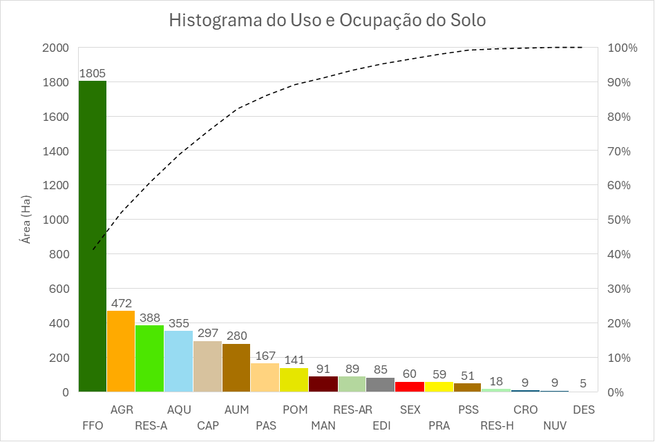 Figura: Histograma de frequência das classes de uso e ocupação do solo. O gráfico ilustra a dominância da Formação Florestal (FFO) e a distribuição decrescente das demais classes, evidenciando a heterogeneidade da paisagem e a relevância de ecossistemas de Restinga e Áreas Úmidas no recorte analisado. A linha (pontilhada preta) cumulativa em um eixo secundário como uma porcentagem do total.