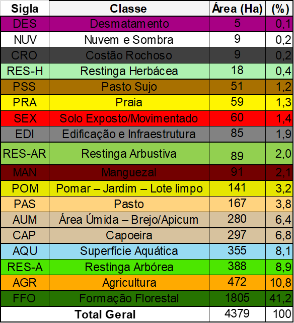 Legenda: Tabela de uso e cobertura do solo contendo as classes mapeadas, suas respectivas siglas, áreas em hectares e participação percentual no total da área analisada.