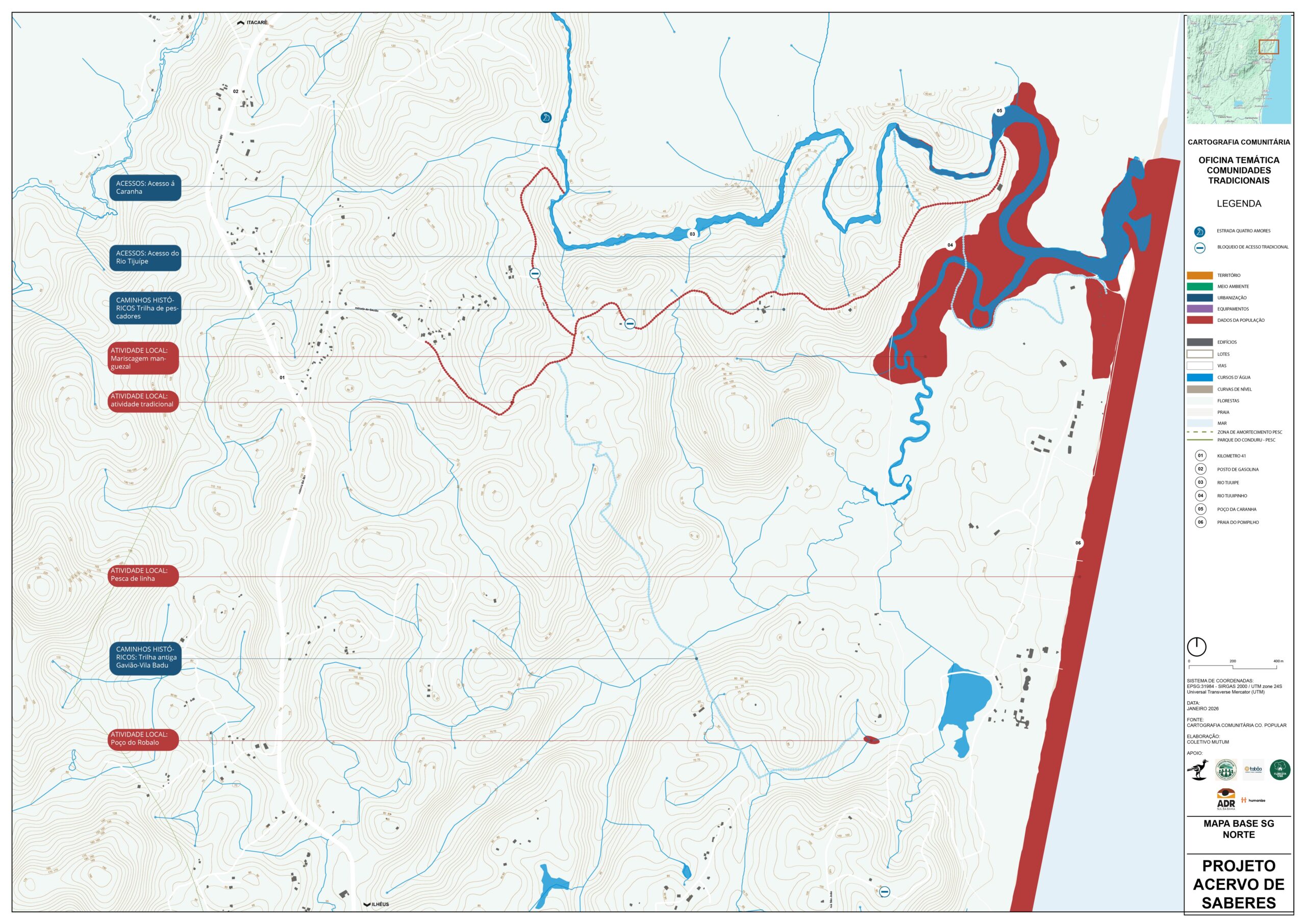 - Proteção da área de foz do Tijuípe e dos acampamentos de pescadores nessa localidade. Atualmente o local precisa ser protegido porque tem sido frequentado por pessoas que não são do território e que levam lixo e som alto. Foi proposto que a área de acampamento seja identificada como zona de interesse das comunidades tradicionais de pesca.