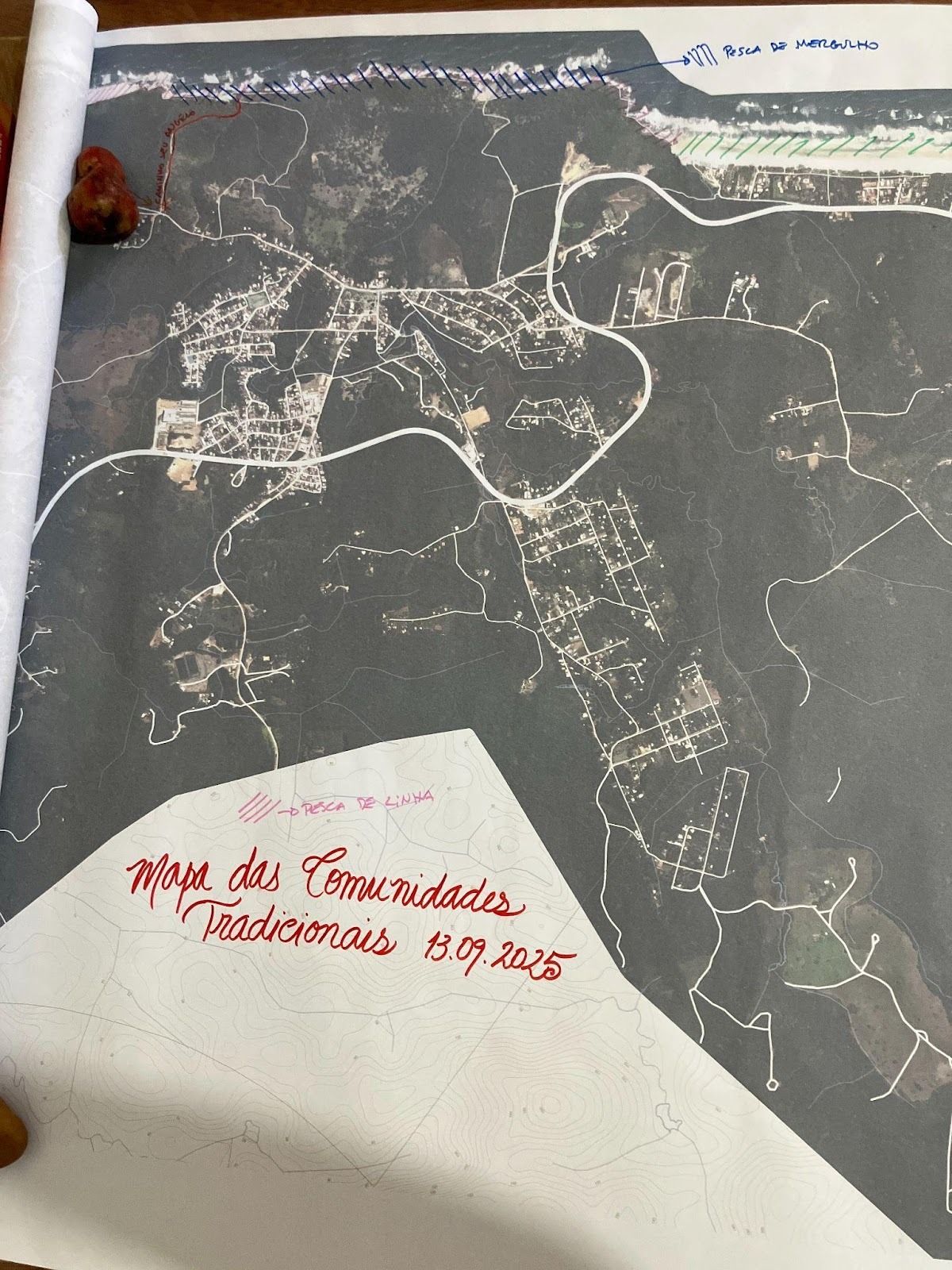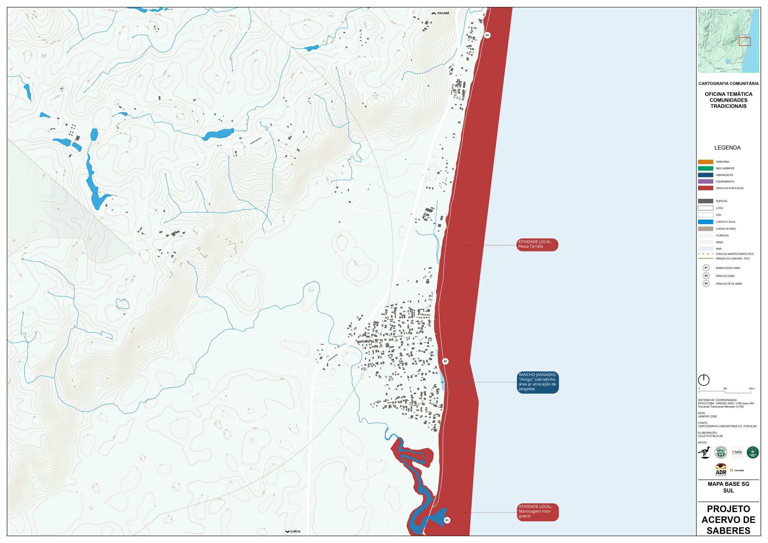 A escuta comunitária com representantes das comunidades tradicionais de Serra Grande possibilitou o mapeamento de áreas de pesca, identificar diferenças entre práticas no mar, rios e outros corpos d’água de Serra Grande, além de levantar demandas por infraestrutura, preservação ambiental e garantia do acesso aos territórios historicamente utilizados. Também foram evidenciados bloqueios e restrições que afetam a continuidade das atividades tradicionais, reforçando a necessidade de reconhecimento e valorização do modo de vida pesqueiro.