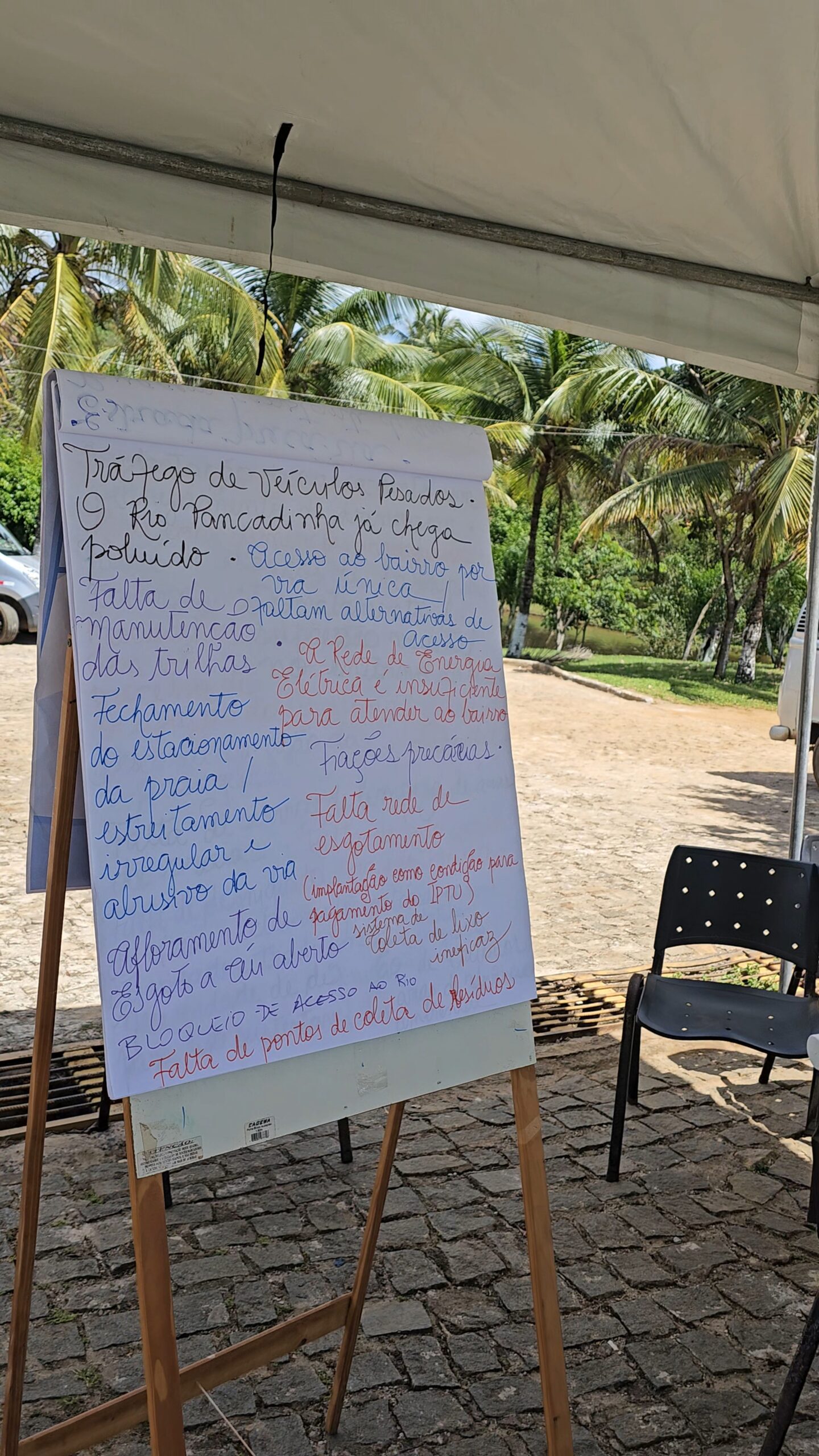 Uma senhora moradora do Conduru chegou espontaneamente na barraca e declarou que, no Conduru tem bares que fazem festinhas com muita bebida, jovens de 15 anos se embebedando, onde há facilidade para conseguir drogas, até drogas pesadas como crack. Por conta disso, começou a ter criminalidade, pois os jovens roubam, principalmente as casas dos forasteiros, para conseguir dinheiro para circular, e essa questão tem que ser melhorada.