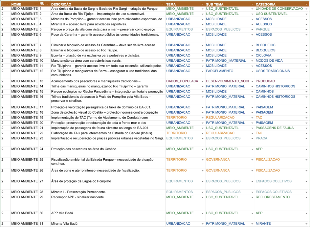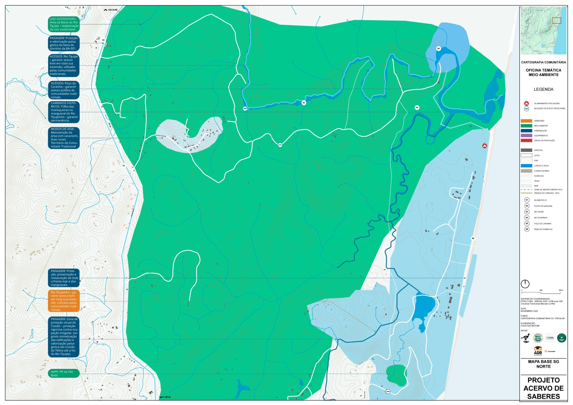 A comunidade destacou o uso e apreciação de caminhos tradicionais, trilhas de acesso às praias, mirantes, cachoeiras, rios e represas, além das áreas costeiras para pesca e lazer. Também são valorizadas a Praia do Pompilho, a Vila Badu, o Poço da Caranha, o Poço do Robalo, o Rio Tijuipinho e os espaços de uso comunitário, como praças e áreas de encontro.