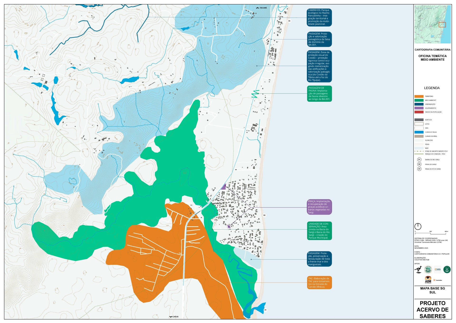 Entre os lugares de maior valor ambiental e paisagístico, destacam-se o Pântano e a Barra do Sargi, os mirantes do Pompilho, as trilhas de acesso às praias, o Poço da Caranha, o Rio Tijuipinho, o Riacho Pancadinha e as áreas de cabruca e Mata Atlântica, todos associados tanto ao lazer e contemplação quanto ao uso tradicional pelas comunidades locais. São também os espaços que a população mais aprecia e frequenta, reforçando a ligação afetiva e cultural com o território.