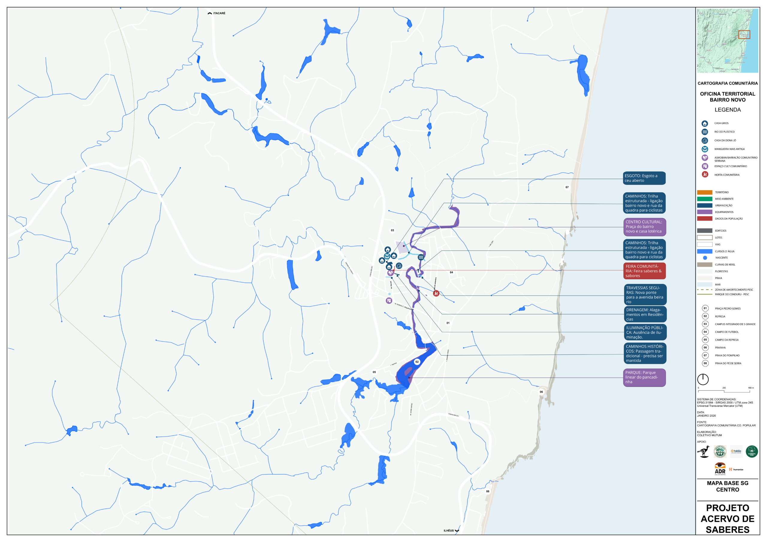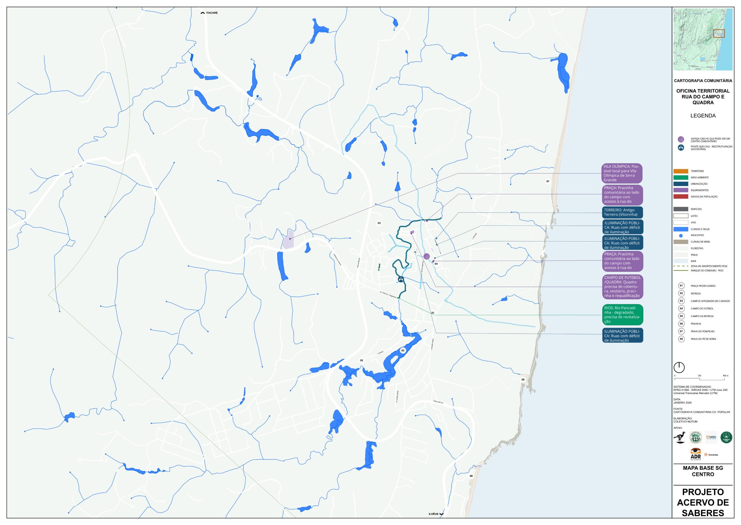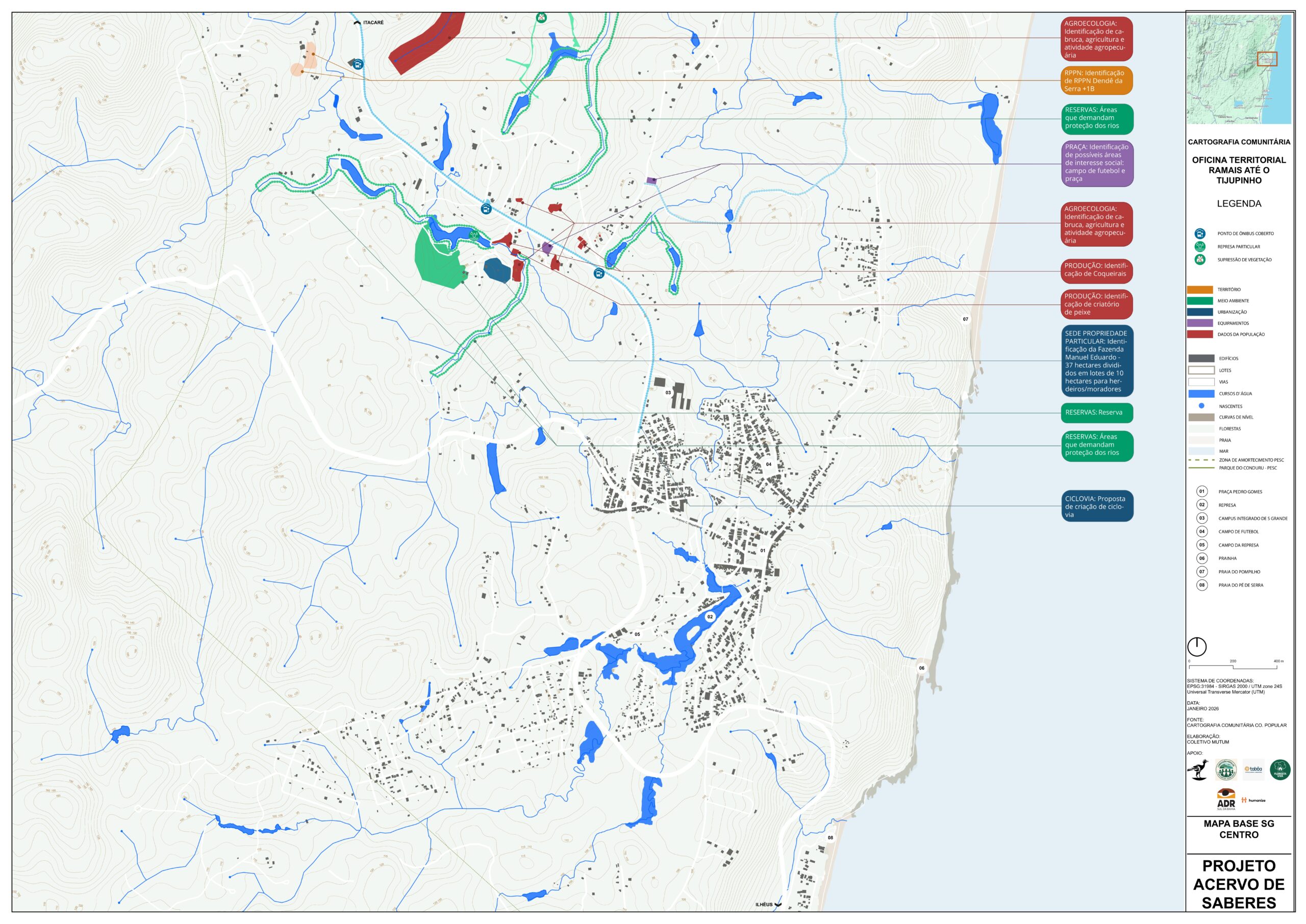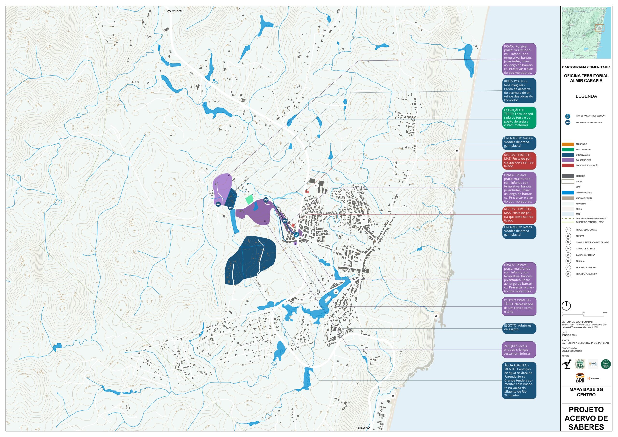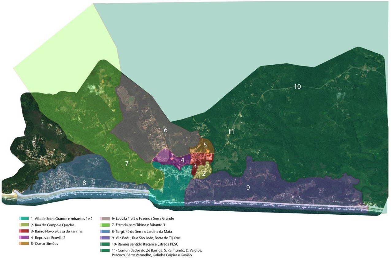 As oficinas territoriais foram distribuídas em 11 áreas — Sargi e Pé de Serra, Gavião, Vila Badu, Represa, Centro, Ruas do Campo e da Quadra, Bairro Novo, Ecovilas, Ramais do Tijuipinho, Almir Carapiá e Tibina — e revelaram a diversidade de modos de vida, desafios e potenciais da vila e de seu entorno.