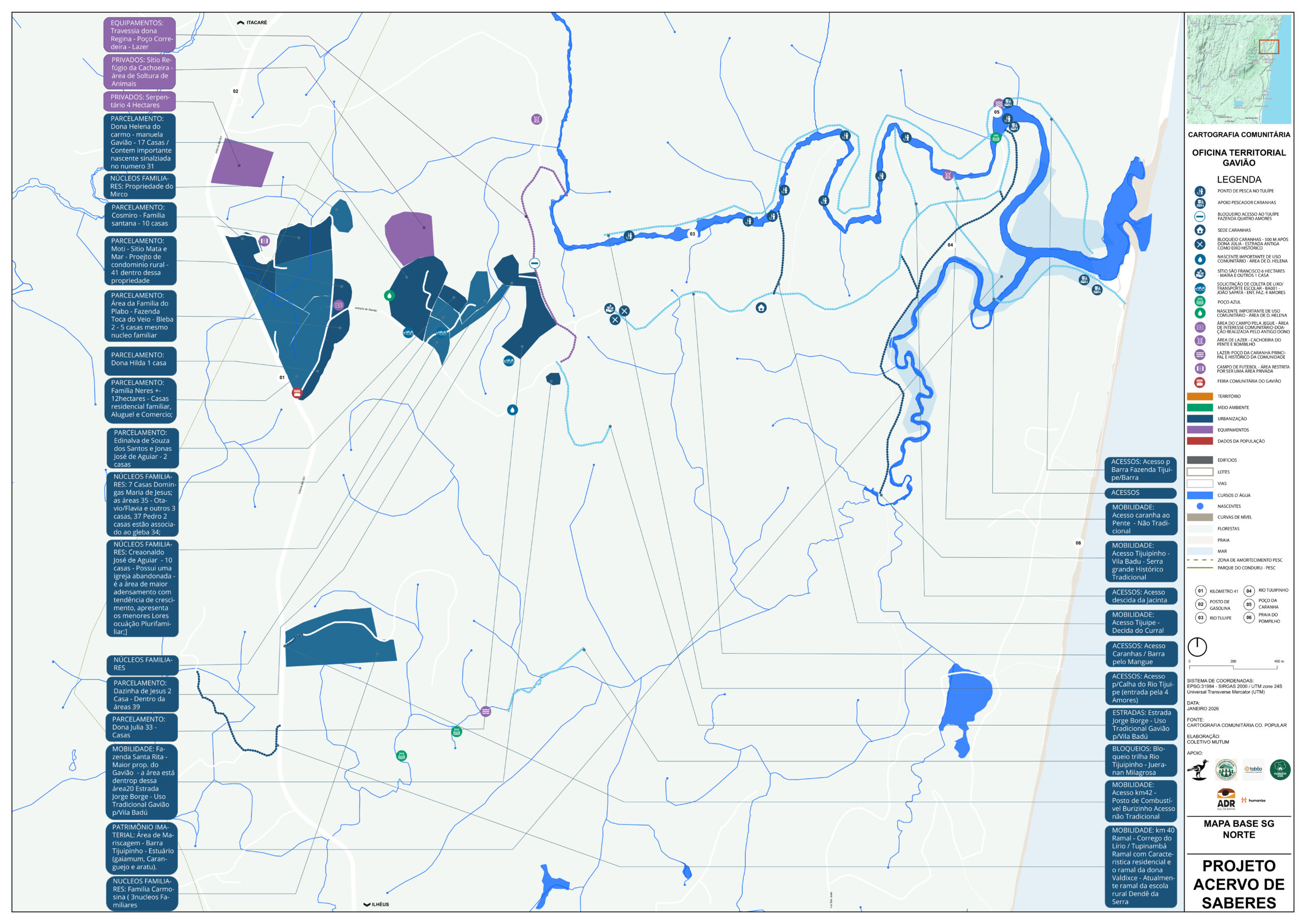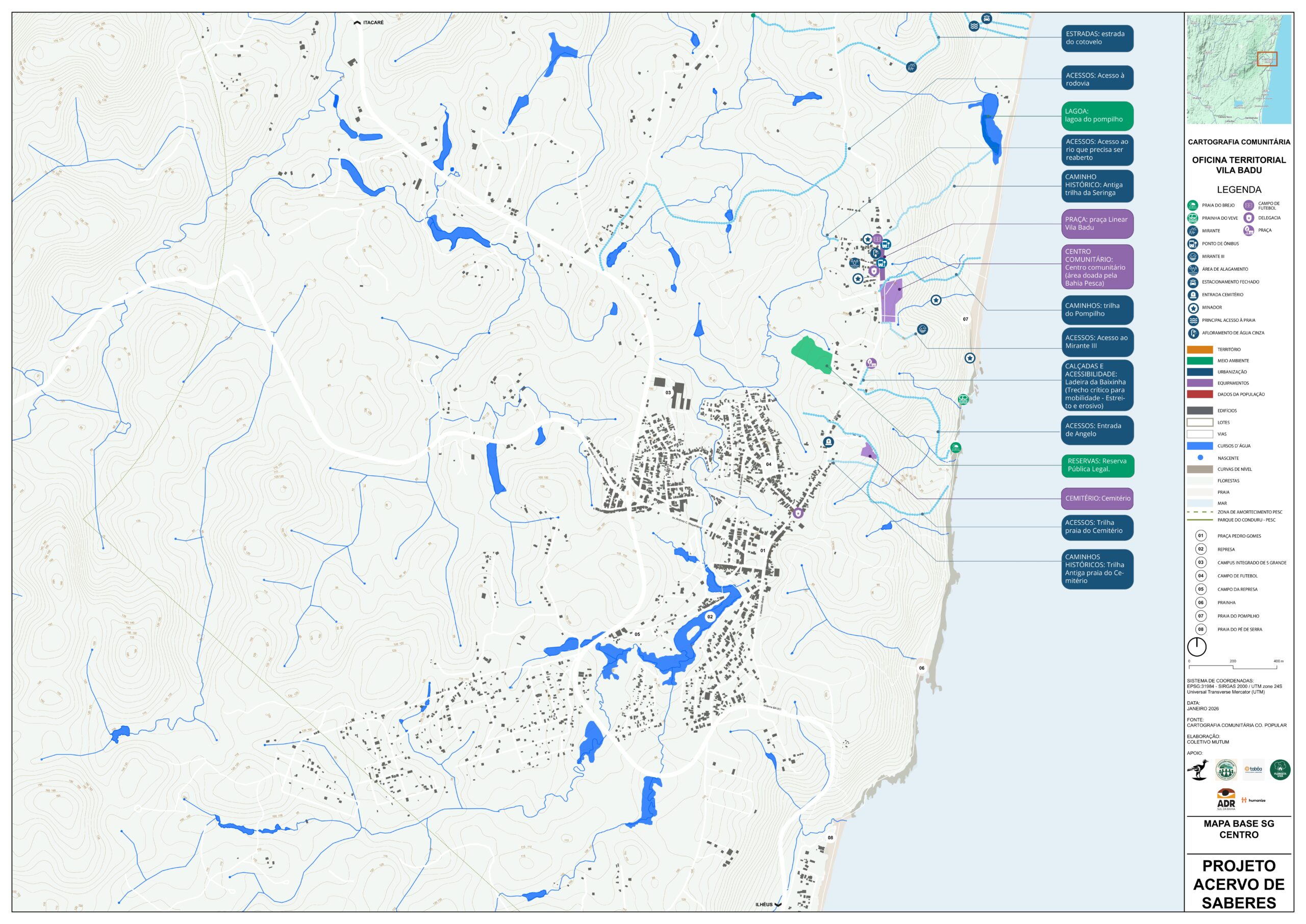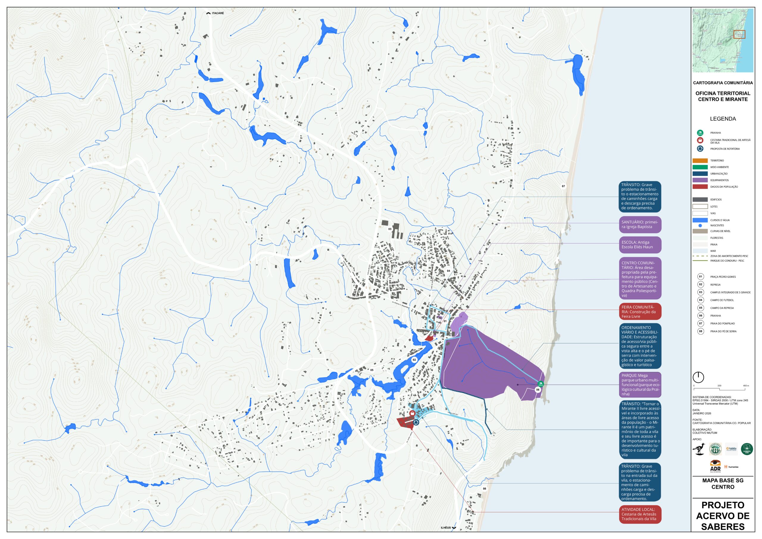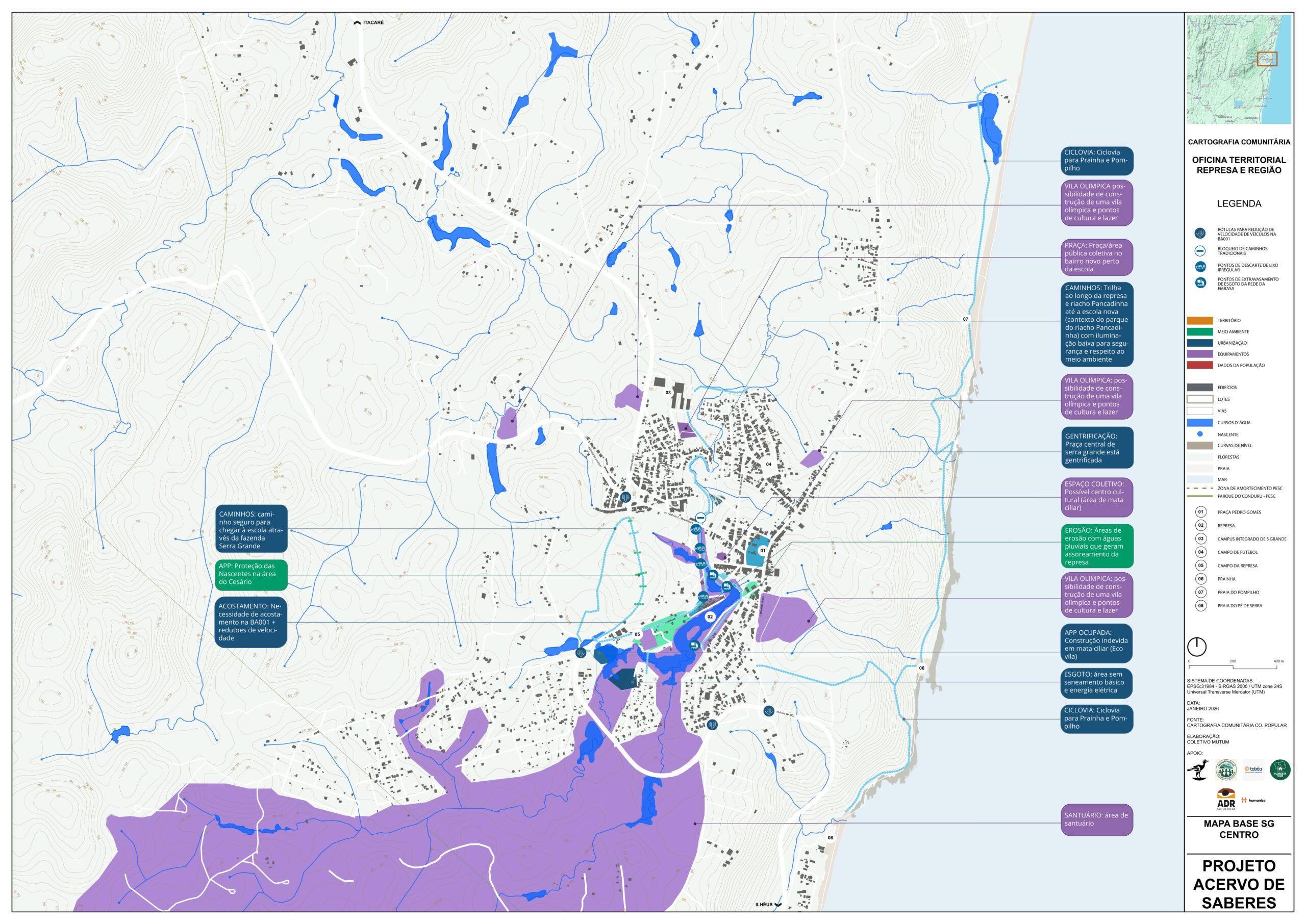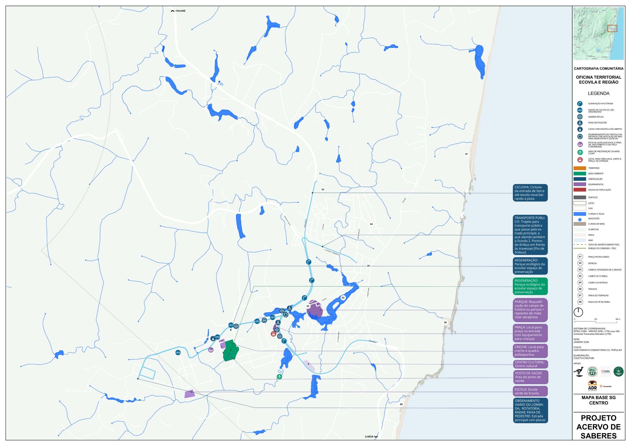 As oficinas territoriais foram distribuídas em 11 áreas — Sargi e Pé de Serra, Gavião, Vila Badu, Represa, Centro, Ruas do Campo e da Quadra, Bairro Novo, Ecovilas, Ramais do Tijuipinho, Almir Carapiá e Tibina — e revelaram a diversidade de modos de vida, desafios e potenciais da vila e de seu entorno.