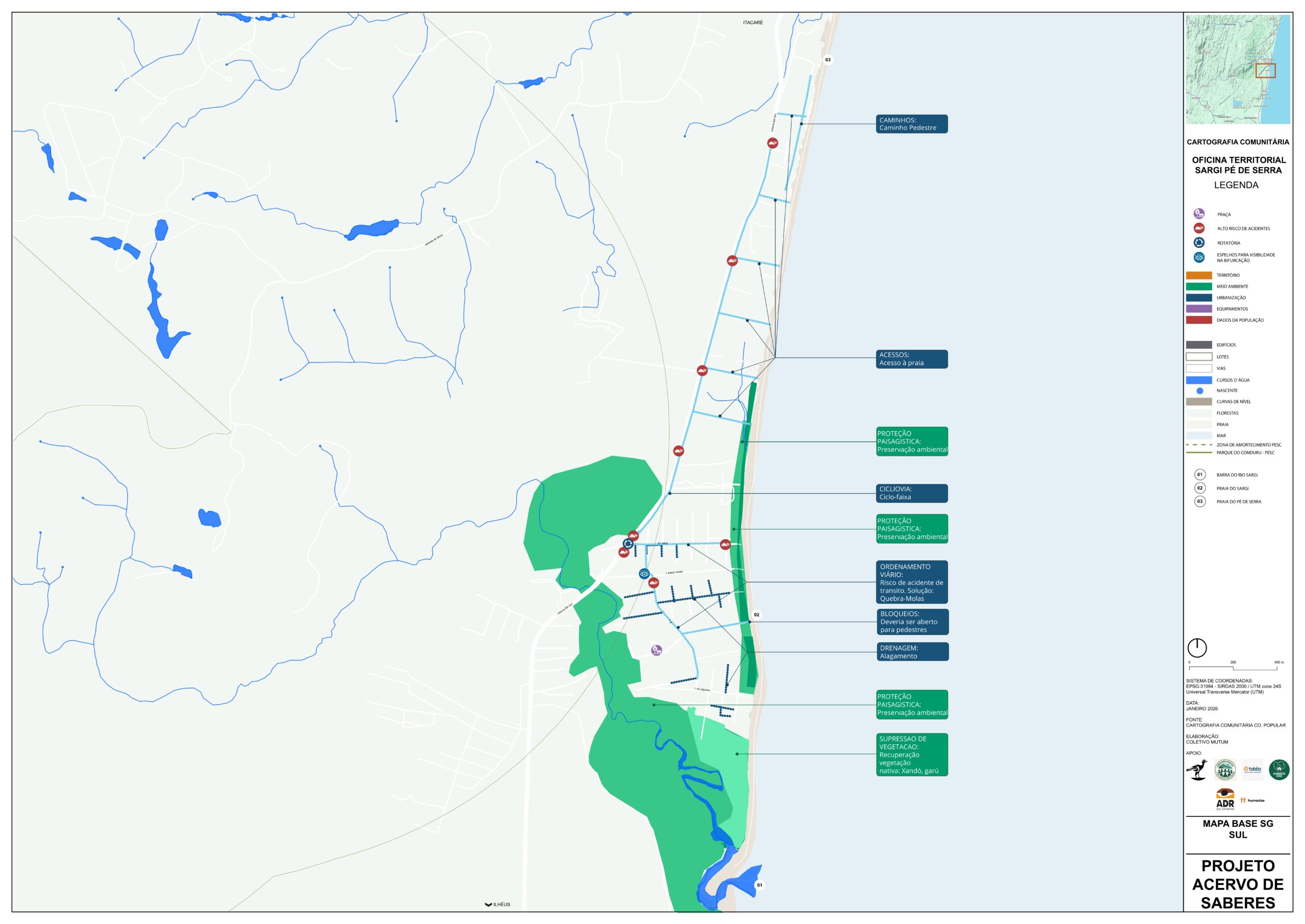 O Sargi e Pé de Serra são reconhecidos como territórios singulares da planície costeira, onde se integram praia, mata e rio, compondo um espaço de lazer, turismo, esporte, surf, pesca e moradia. A escuta territorial aconteceu no dia 30 de agosto de 2025, no restaurante Sargimar, e reuniu em torno de 40.